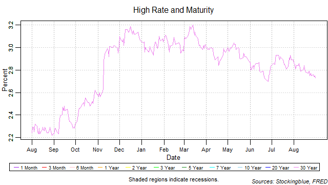 Short-term rates paused their steady rise in August but medium and long-term rates began to fall. The yield curve continues to shrink but it only indicates a recession if it shrinks from the bottom up. The upward tick in the short-term maturities' rates pause is promising as it is a decent indicator that a recession is not on the horizon. All rates fell in August with the exception of the one-year note which rose slightly.