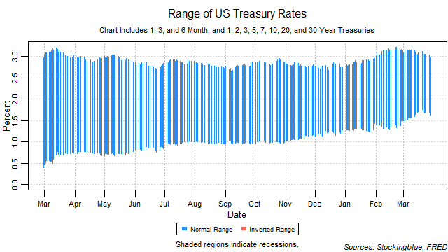 The breadth of the yield curve narrowed over the month from a range of 1.63 to a range of 1.34. The widest range was 1.64 on March 2 and the narrowest 1.34 which was hit three times on March 14, 27, and 29.