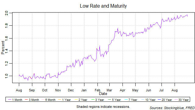 The one-month note held the lowest rate for every session of the month. However, it has hit a new 12-month high for the fourth time in four months and has not been as high as 1.97 (its high for the month) since June 10, 2008 when it was at 2.00.