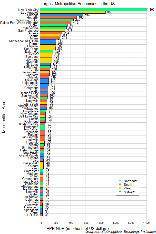 The chart above shows the largest metropolitan economies in the United States that happen to also be among the world's largest 300 metropolitan economies based on the Brookings Institution. Each region of the US has a city in the top four.