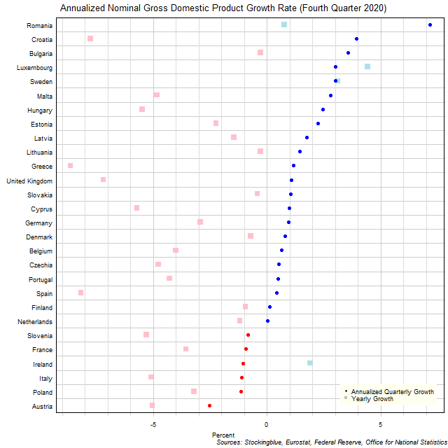 The chart above shows the annualized nominal gross domestic product (GDP) quarterly growth rate in each EU state as of the fourth quarter of 2020 and the growth rate from one year prior. Six states' economies contracted over the previous quarter.