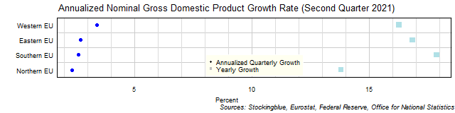 The chart above shows the annualized nominal gross domestic product (GDP) quarterly growth rate in each EU region as of the second quarter of 2021 and the growth rate from one year prior. All four regions grew over the previous quarter.