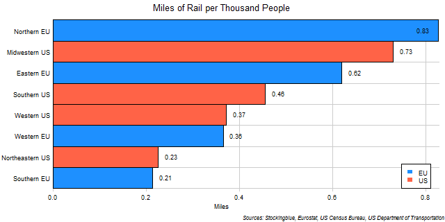 The chart above shows kilometers of rail per thousand people in EU regions. Only the Northern EU has over one kilometer of track for every thousand people in its region.